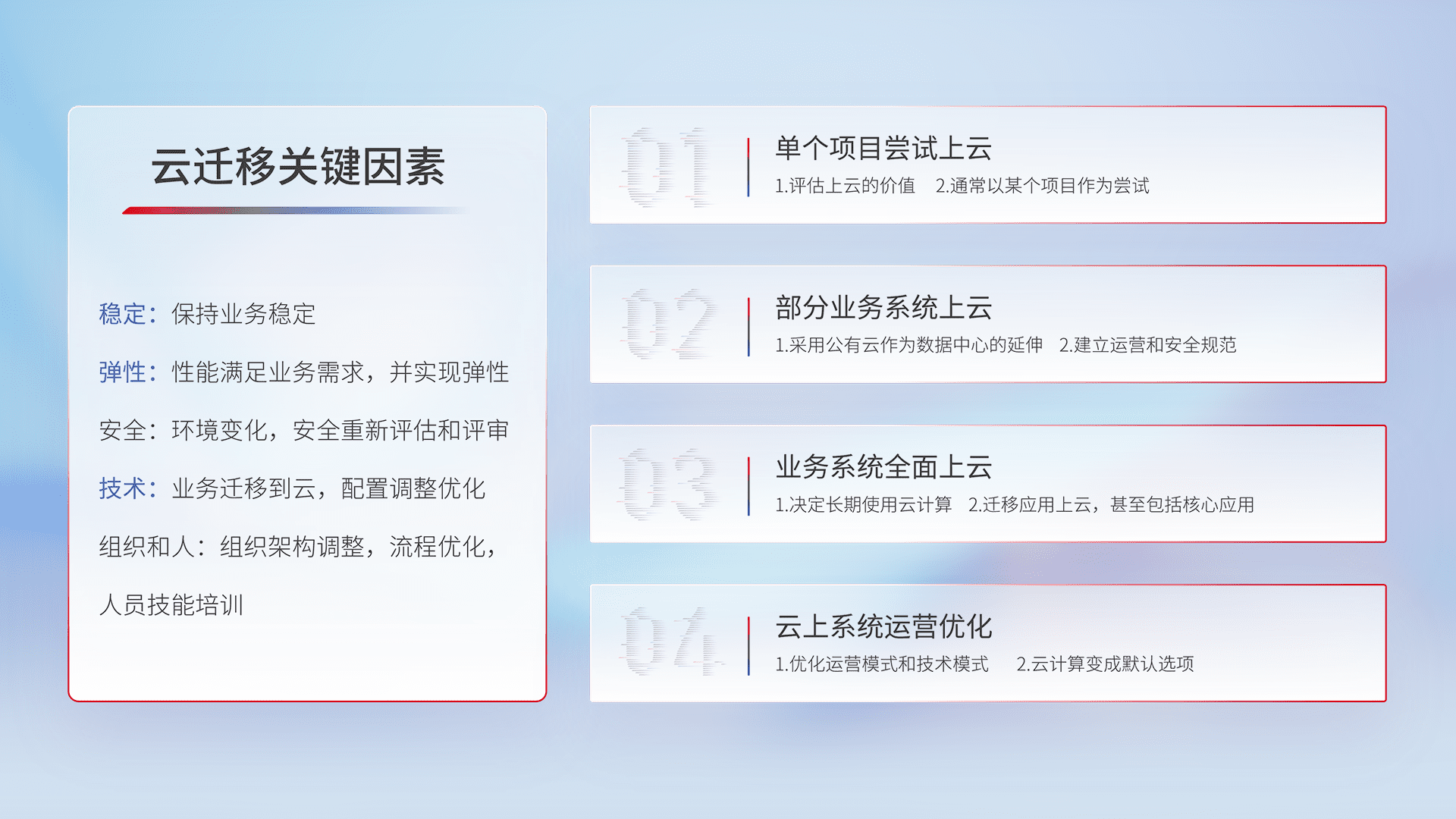 结合实际业务,,,,从规划设计、、云平台选型、、、云原生改造、、、数据迁移、、、、集成交付,,迁移全过程为客户识别最佳上云路径,,做好风险识别管理,,,设计网络架构、、身份权限、、、、安全审计合规、、操作审计、、日志审计、、、监控告警策略、、多站点容灾设计等,,,对云上基础设施进行整体规划,,,,提升IT治理水平,,以满足弹性、、高可用、、、、高性能的需求。。。