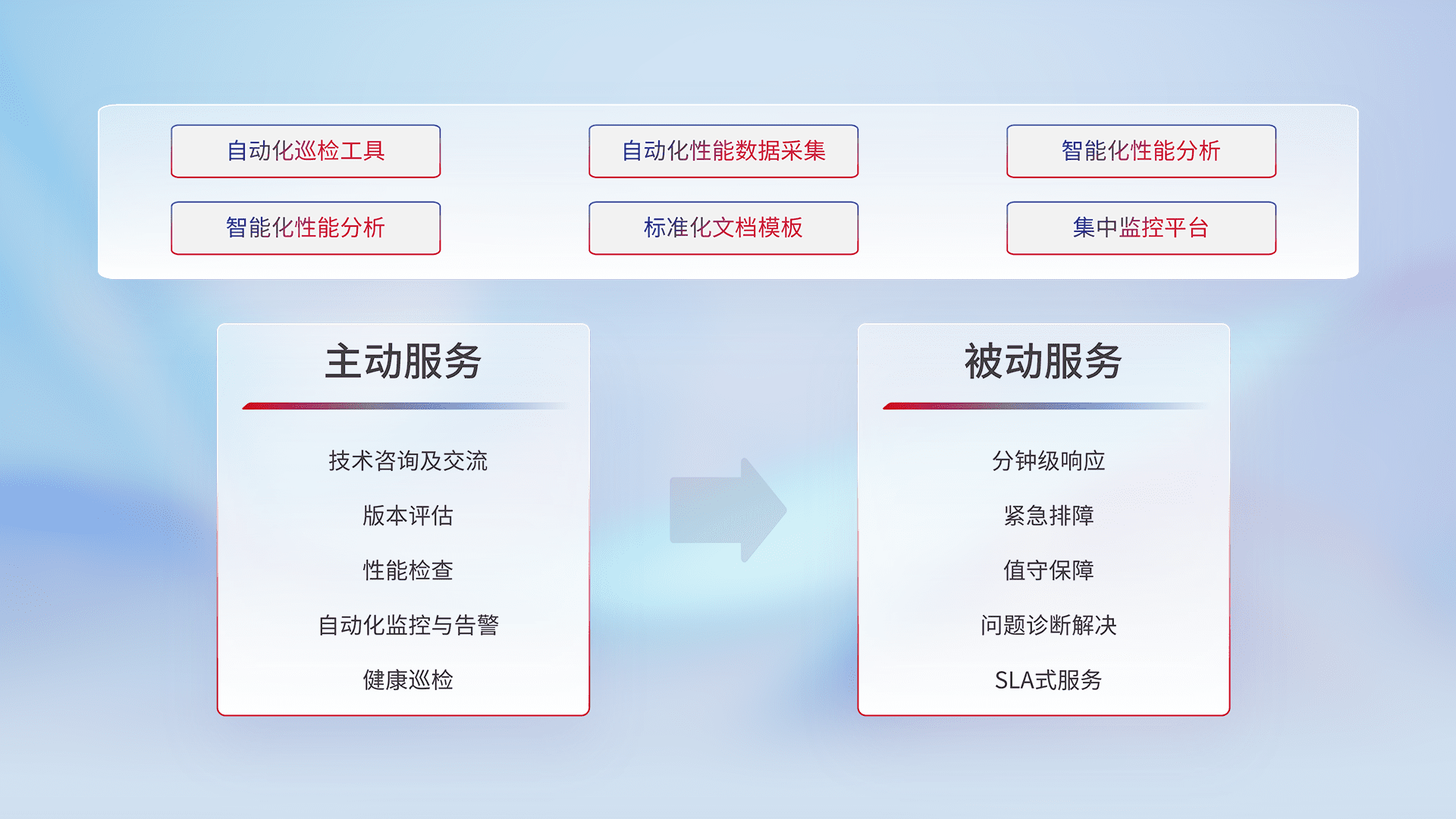 智能化工具和标准化文档,,,,保障服务质量,,,,提供主动服务(包含技术咨询、、、版本评估、、、、性能检查、、自动化监控与告警、、、健康巡检)和被动服务包含(分钟级响应、、、、紧急排障、、、、值守保障、、问题诊断解决、、、SLA服务)。。